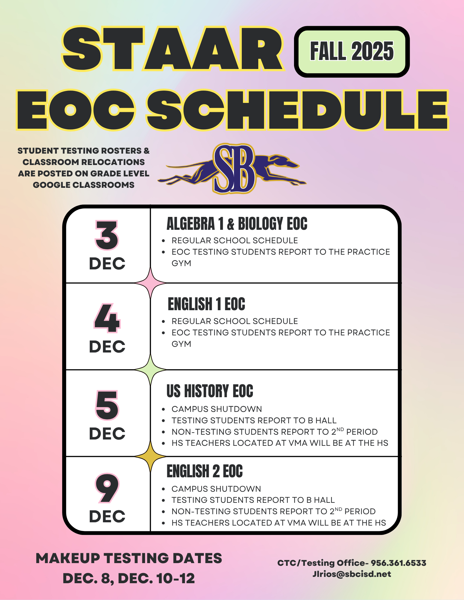 When we return from Thanksgiving break, we will begin STAAR EOC testing. If you are retesting for English 1, Algebra 1, or Biology - your testing begins December 3rd in the practice gym.